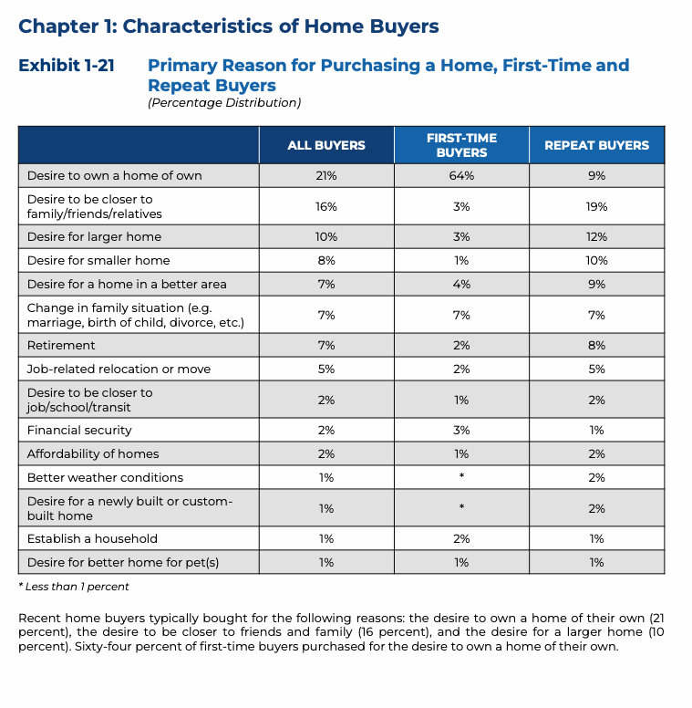 - First-time buyers primarily purchase because they want to own a home rather than rent.